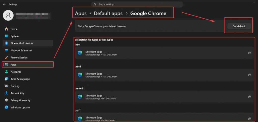 Note: If you do not see the “Set default” button, ensure your Windows 11 is updated to the latest version via Windows Update.