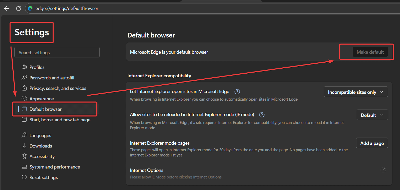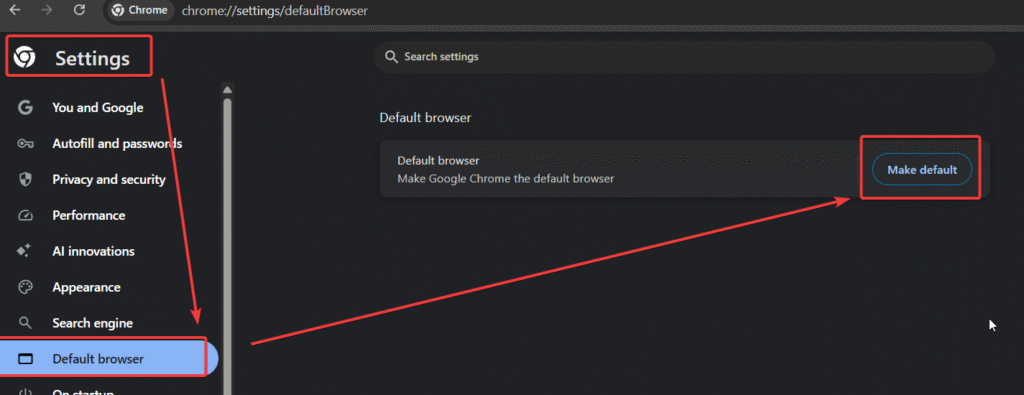 - Windows 11: Click the browser name and hit the Set default button at the top.