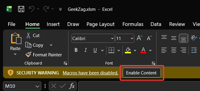 - Click the “Enable Content” button. This will enable the macros for your current session.