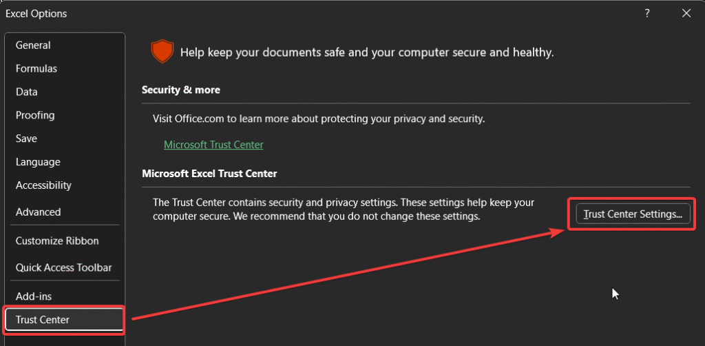 - Go to File > Options > Trust Center > Trust Center Settings….