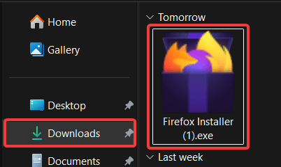 Once the download is complete, open your File Explorer and go to the Downloads folder. You should see the file you just downloaded. For example purposes, let’s try to install Firefox. (e.g., Firefox Installer.exe).